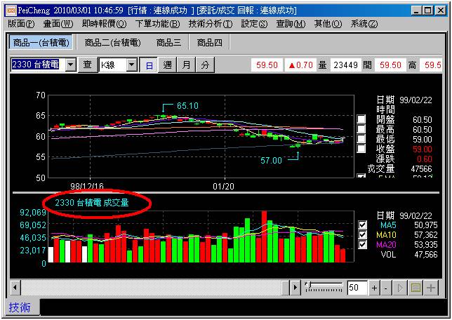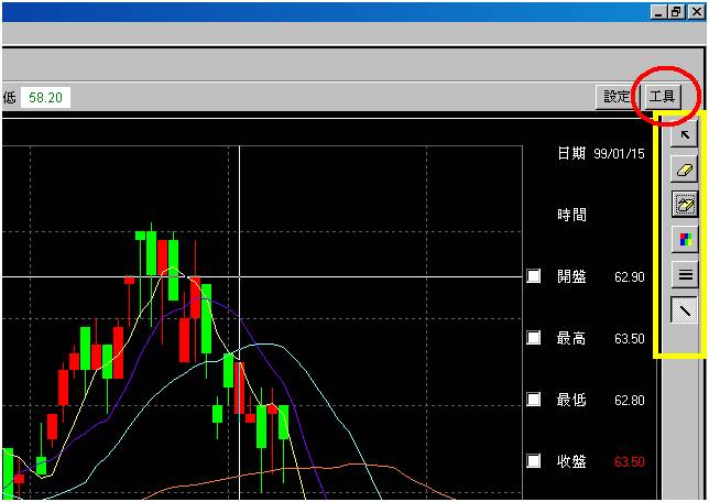 於個股分時價量視窗(黃圈處),點取技術按鈕。