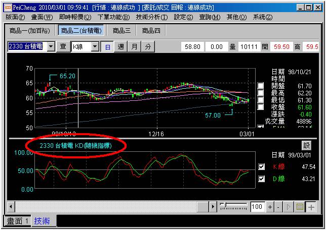 範例四:郤將下方成交量指標(紅圈處)更換為KD指標。