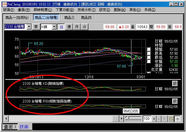 於kd指標視窗按滑鼠右鍵,依序選取常用->RSI->下