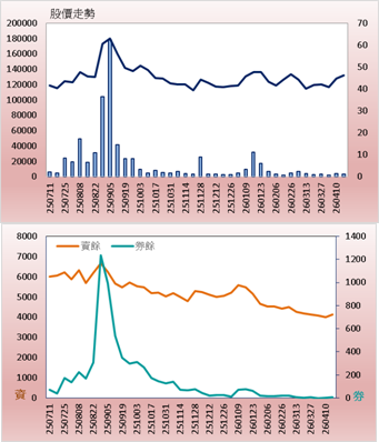 | 2026/4/15 股價 | 46.30 | 法人買賣超合計(近一日) | 買超 210.154 張 | |||||||||||||||||||||||