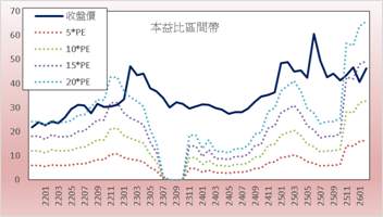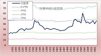 | 股價 | 41.85 | 42.15 | 40.75 | 44.75 | 46.30 | 15*PE | 49.26 | 2*PB | 50.60 | |||||||||||||||||