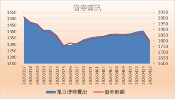 | 2026/4/15 漲跌幅 | -0.43 | 法人買賣超合計(近一月) | 買超 1087.05 張 | |||||||||||||||||||||||