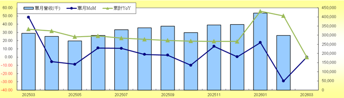 | 202601 | 421,135 | 421,135 | 17.69 | 55.74 | 55.74 | 0.18 | 創歷史新高 | 1,135,150 | 29.46 | |||||||||||||||||
