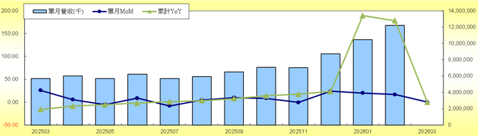 | 202602 | 12,198,386 | 22,649,979 | 16.71 | 169.43 | 178.23 | 創歷史新高 | 31,361,725 | 147.68 | ||||||||||||||||||