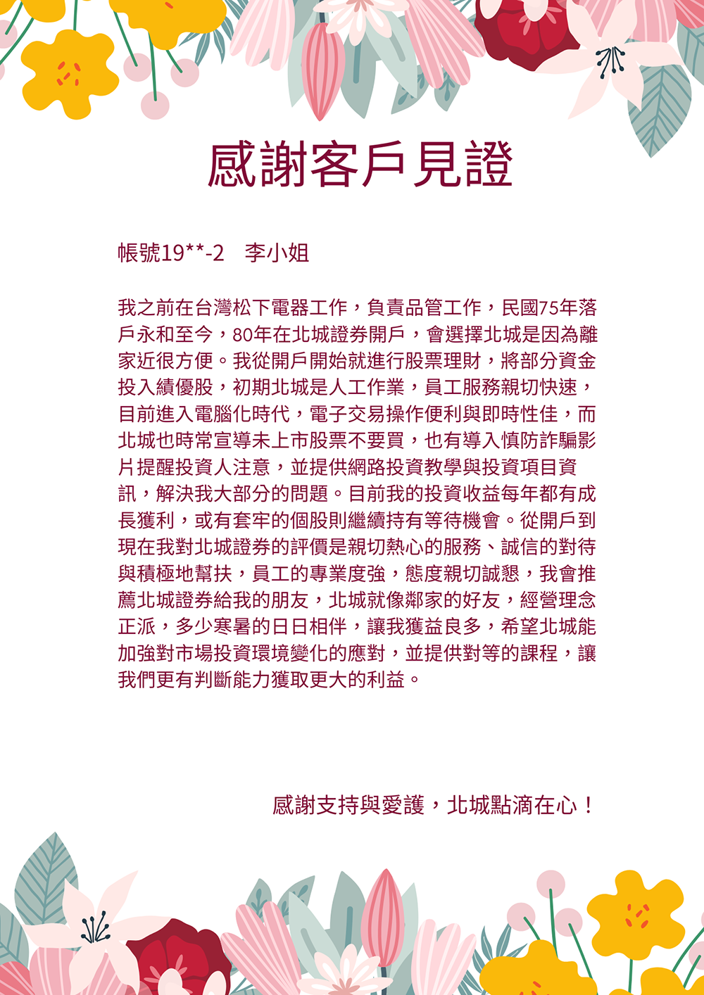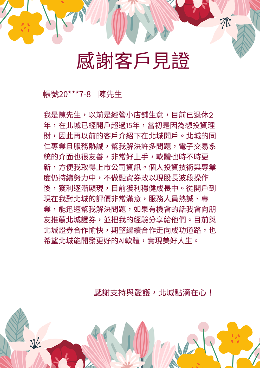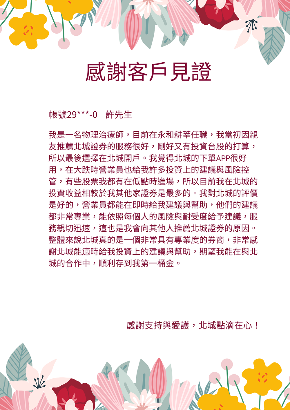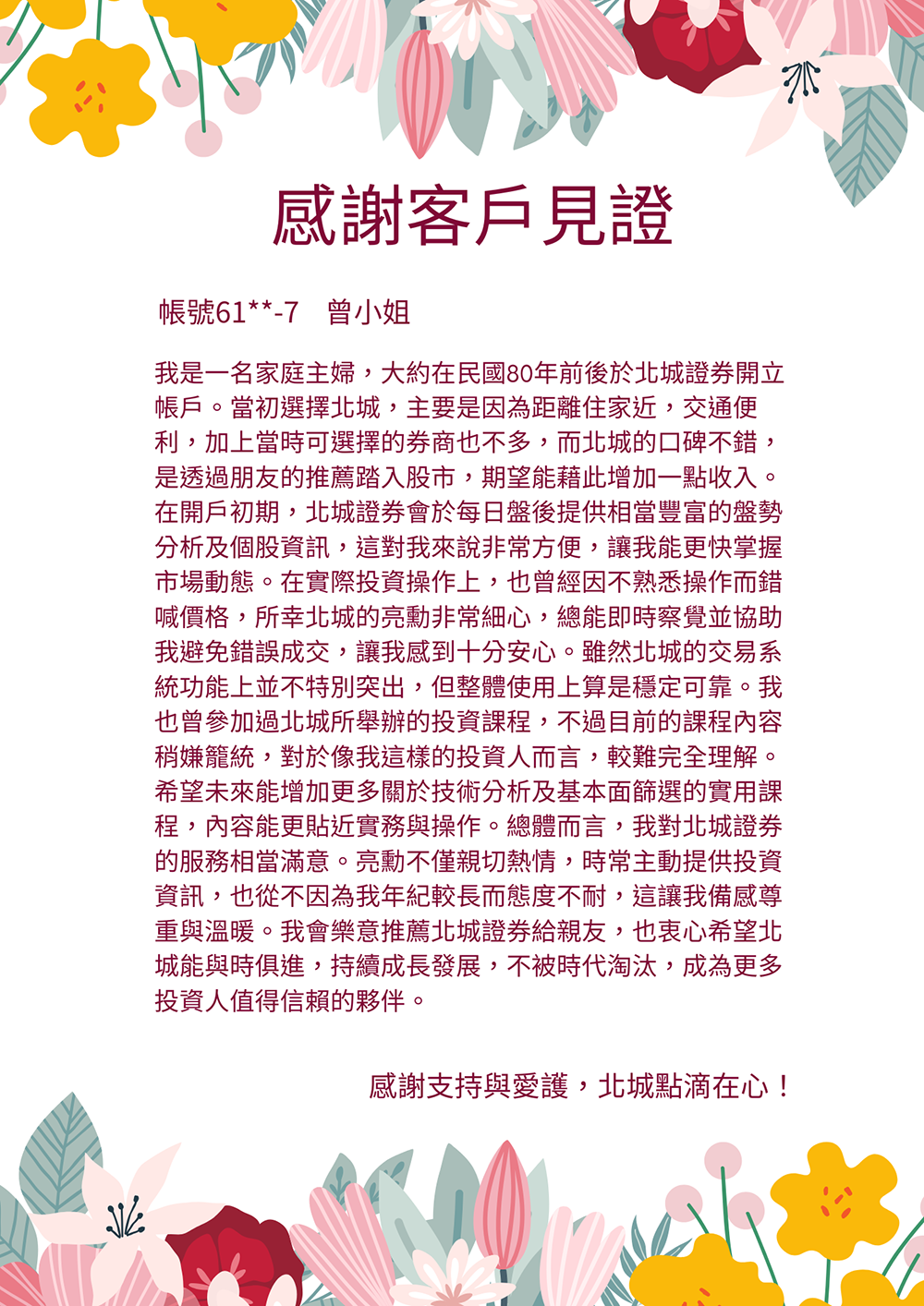 「我在民國80年因住在永和方便而選擇在北城開戶,從此投入股票理財。多年來北城員工親切專業、服務誠信可靠,讓我投資收益穩定成長,也推薦朋友來開戶。」