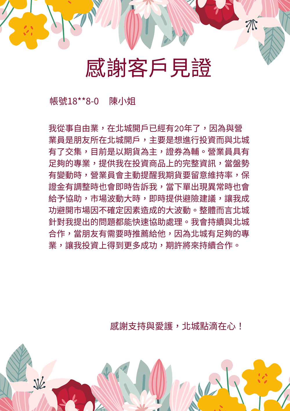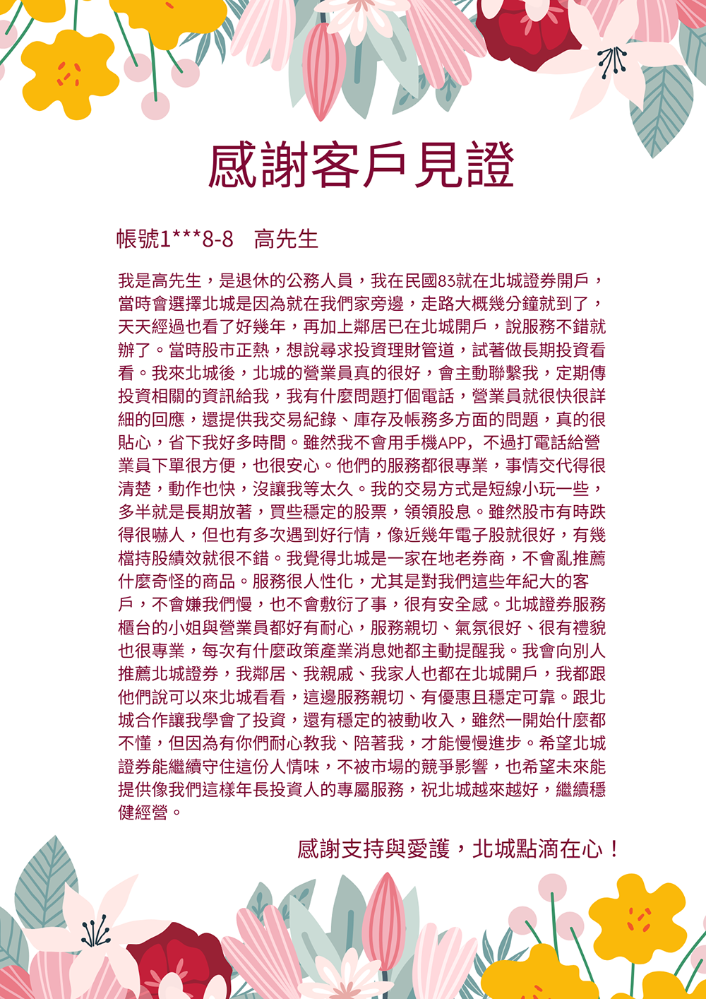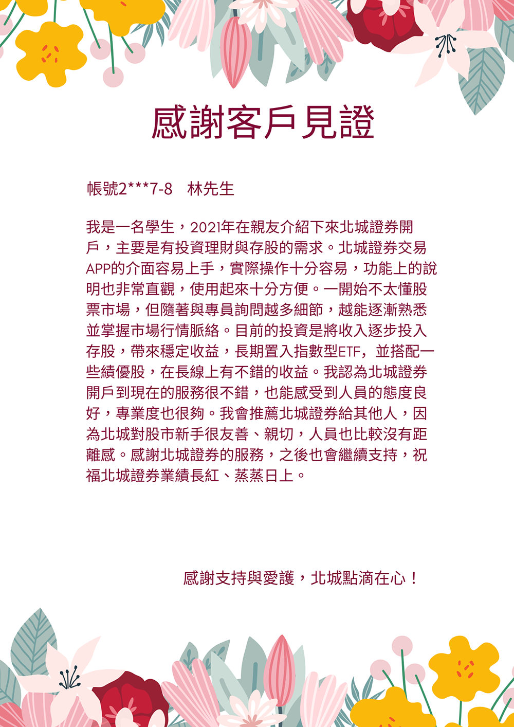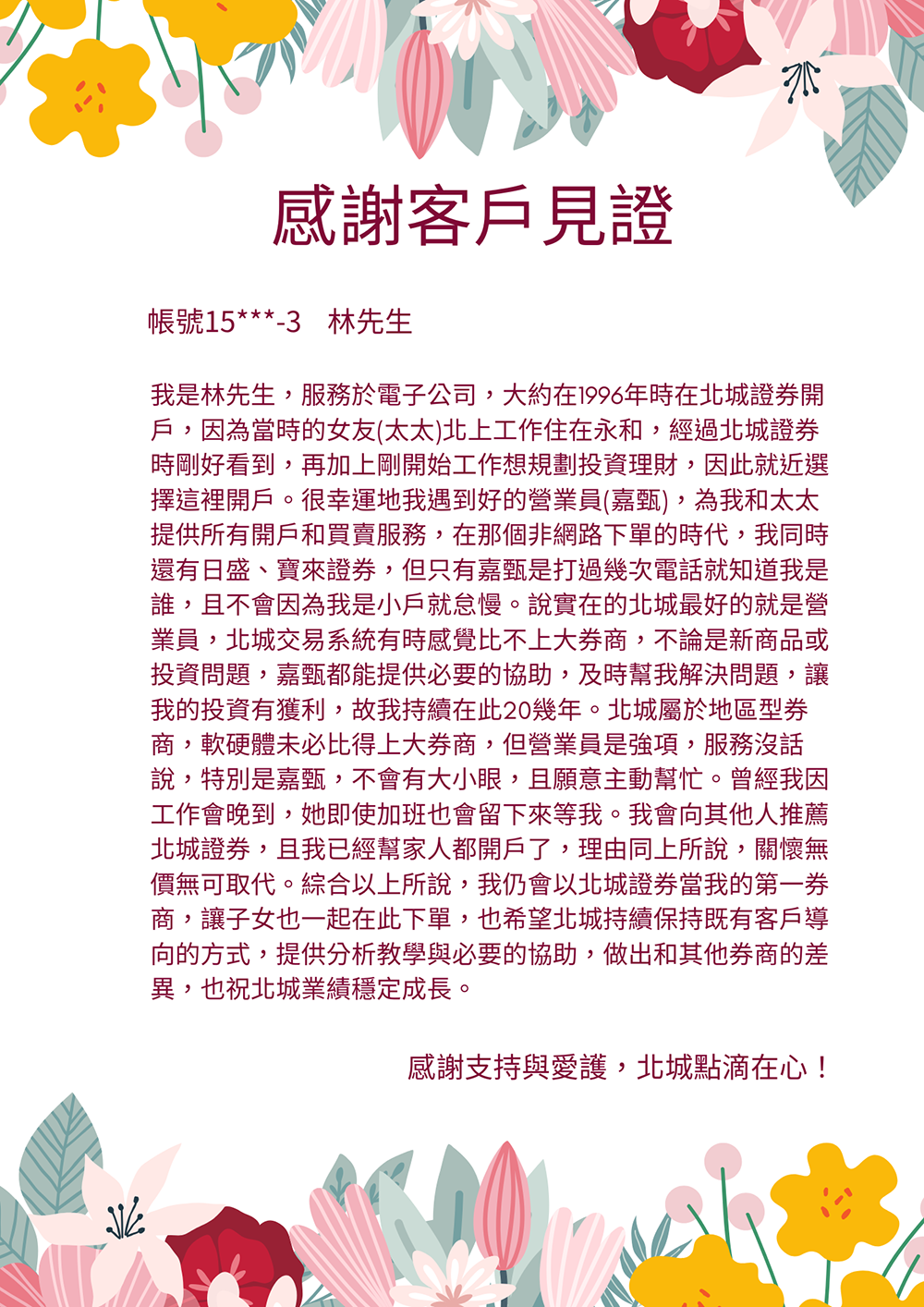 「我在民國80年因住在永和方便而選擇在北城開戶,從此投入股票理財。多年來北城員工親切專業、服務誠信可靠,讓我投資收益穩定成長,也推薦朋友來開戶。」